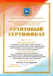 В 2015 году Самарское отделение СТД приняло участие в конкурсе на соискание Губернских грантов в области культуры и искусства за второе полугодие 2015 года. По итогам конкурса проекту отделения «Самарский театральный альбом. Альбом 1: «Легенды Самарской сцены. Петр Монастырский в академическом театре драмы им. М. Горького» (к 100-летию со дня рождения)» был присужден Грант.